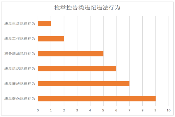 从检举控告类违纪违法行为来看,违反组织纪律6件,占20%;违反廉洁纪律7件,占23.33%;违反群众纪律9件,占30%;违反工作纪律2件,占6.67%;违反生活纪律1件,占3.33%;职务违法犯罪行为5件,占16.67%。