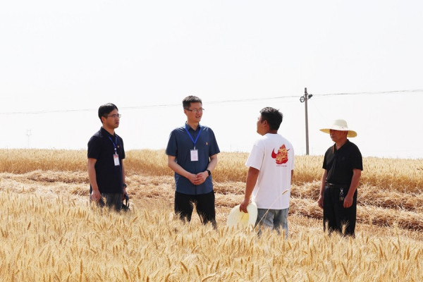 图为胡松(左二)正在田间地头向群众调查核实相关问题线索。