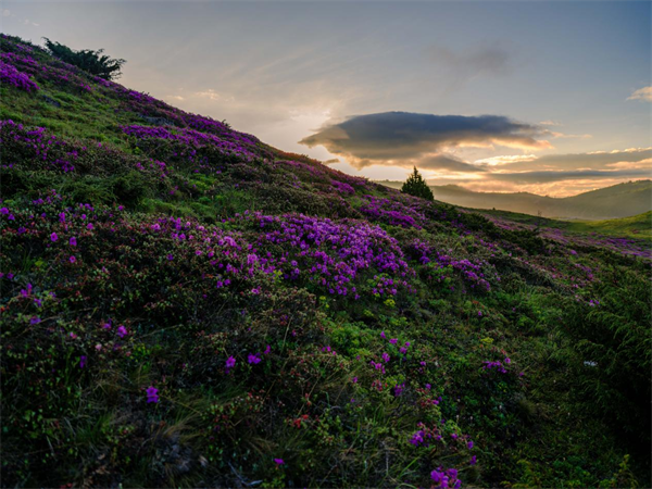 夏至已至,云南迪庆德钦境内的岗珠拉卡牧场目之所及皆是浓郁翠绿,生长在海拔4800米左右的高山杜鹃也进入了盛放期。(斯娜卓玛 摄)