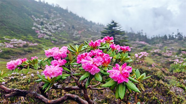 每年立夏杜鹃盛开的时候,是香格里拉最烂漫的季节。东旺乡虫草山上的高山杜鹃满山怒放,铺满整个山林,将雪域高原绘成引人入胜的秘境。( 杨雪婷 摄 )