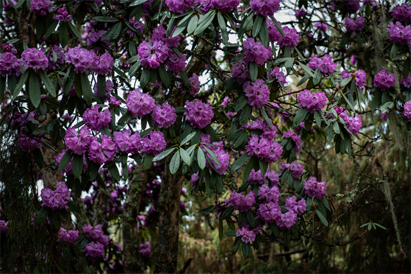 谷雨时节,维西县腊八底的高山杜鹃肆意盛放,紫艳花团层层叠叠,将枝头晕染成浪漫的云霞。缕缕松萝如银丝垂落,缠绕在繁花绿叶间,为这片高原花海添上了灵动的诗意。(董继荣 摄)