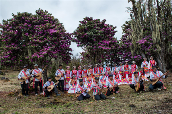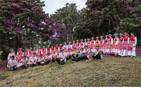 谷雨时节的维西县腊八底村,紫艳繁花铺染山野,瓦器器非遗传承同胞齐聚花海,傈僳族服饰色彩斑斓,乐声婉转悠扬,将原生态民俗与烂漫花海完美交融,绘就高原独有的春日人文画卷。(董继荣 摄)