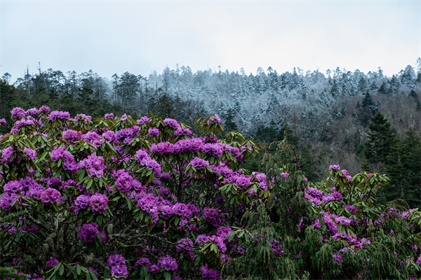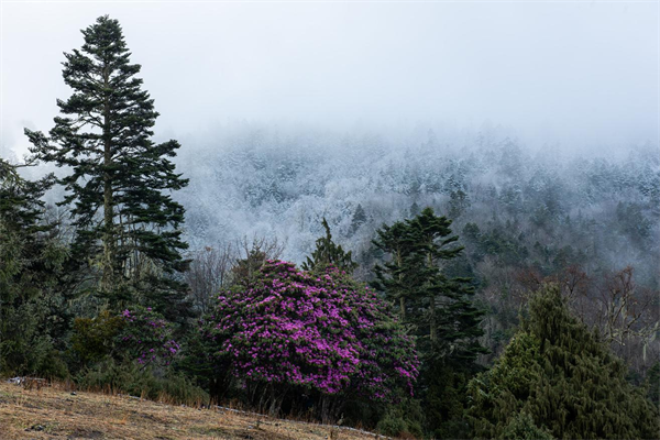 谷雨时节的维西县腊八底村阿宝阁,云雾漫过层峦,高山杜鹃在坡地肆意盛放,紫艳花团热烈蓬勃。远处山林覆着暮春残雪,清冽与鲜活遥遥相映,尽展滇西北高原独有的春日盛景。(董继荣 摄)