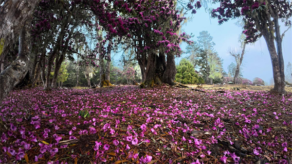 谷雨时节,维西县腊八底村的高山杜鹃迎来盛花期。枝头紫艳花团层层叠叠,如云霞漫卷,在松萝掩映间尽显蓬勃生机。林间地面,落花铺就满地锦绣,每一寸山野都浸满了春的诗意。(董继荣 摄)